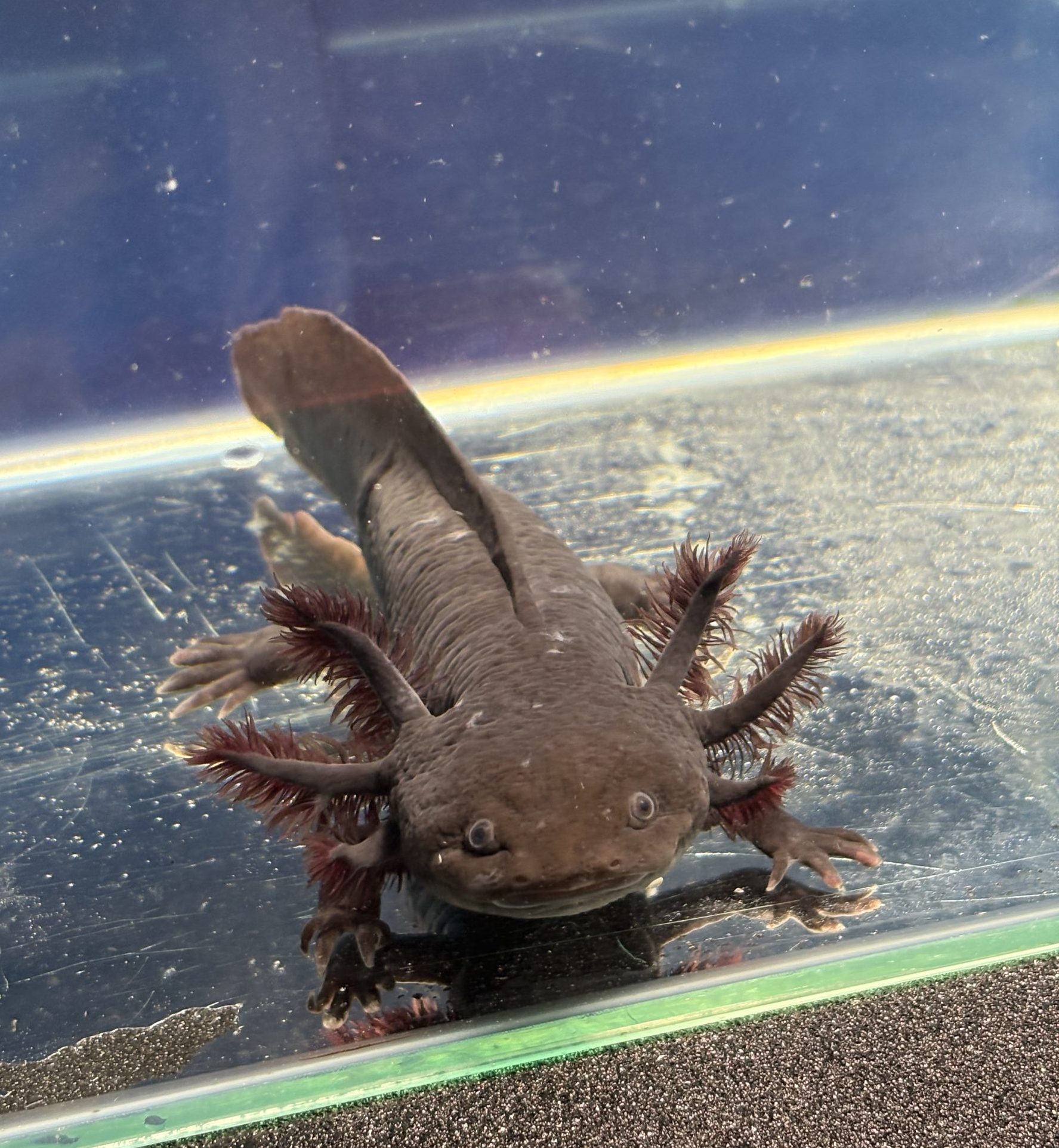 Unique wild type axolotl with different colouring on head and fluffy gills